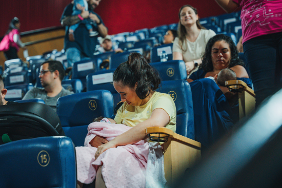 • Presença de voluntárias CineMaterna, que organizam a sessão e acolhem as famílias com cuidado e carinho.