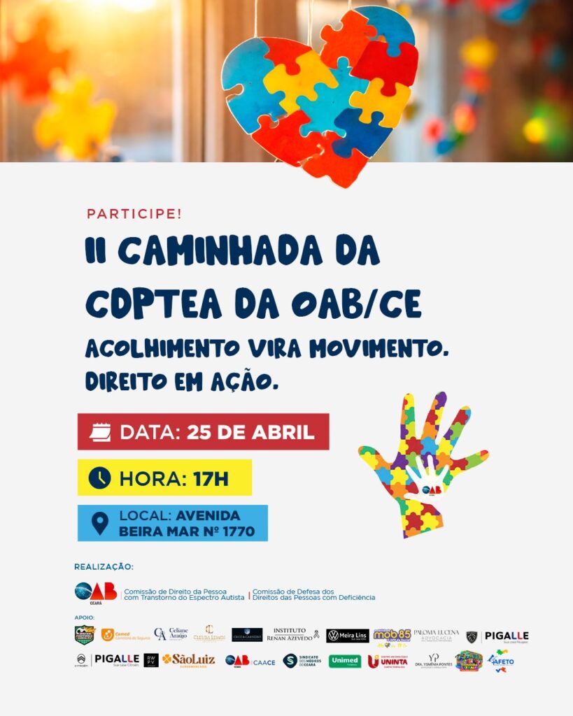 A Ordem dos Advogados do Brasil – Secção Ceará realiza, no próximo sábado (25/4), a 2ª Caminhada pelo Autismo, promovida pela Comissão de Direito da Pessoa com Transtorno do Espectro do Autismo (CDPTEA). A concentração será às 16h, na Avenida Beira-Mar, em frente ao Náutico.
