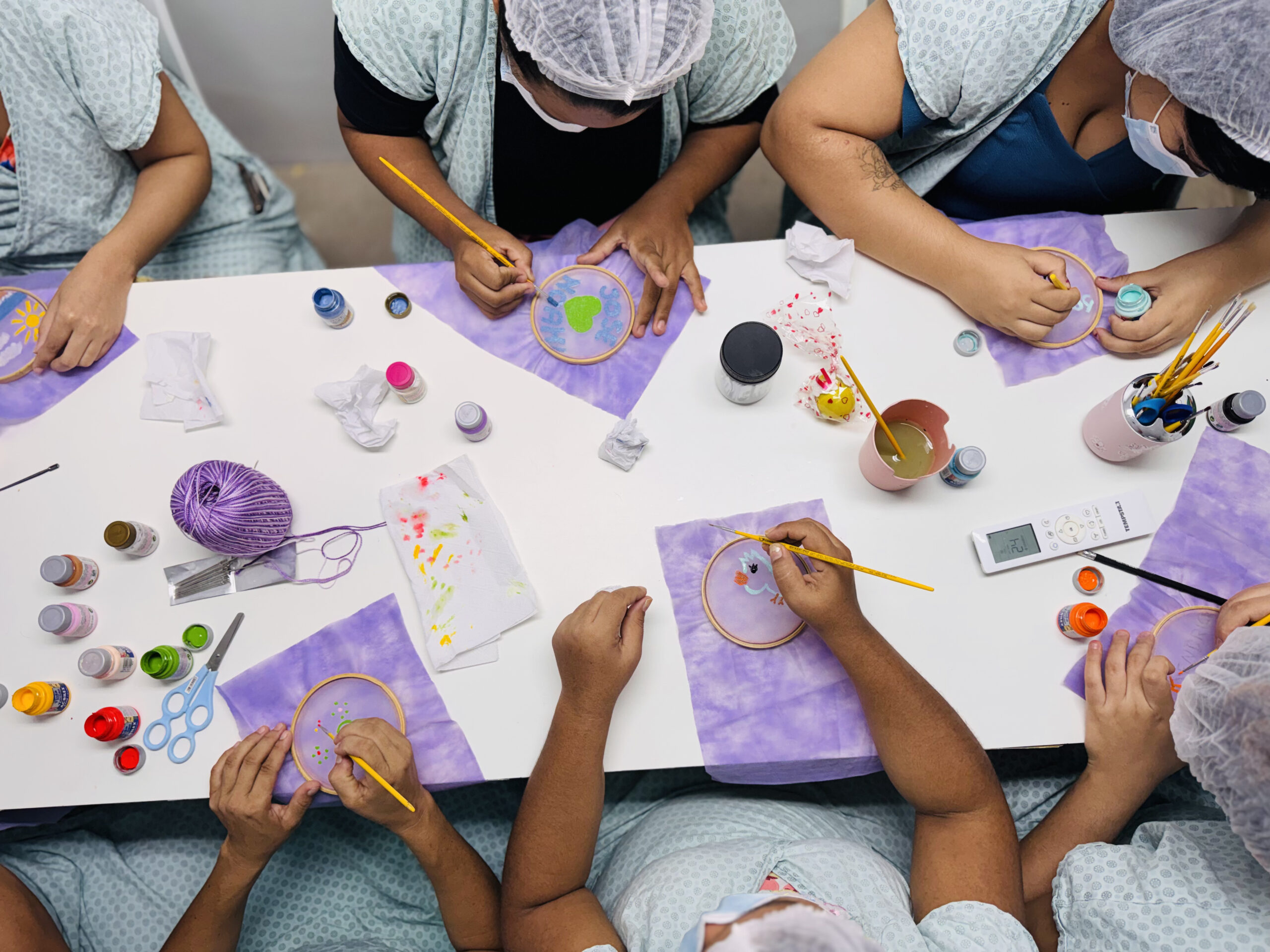 As oficinas utilizam materiais simples e antialérgicos, TNT, bastidor, tinta atóxica e pincel, e ensinam técnicas que as mães podem reproduzir em casa. Entre as produções recentes, destaca-se uma bolsinha para celular com pintura em bastidor, criada para uma necessidade prática do cotidiano hospitalar: como as batas não têm bolsos, o acessório evita que o aparelho fique solto e reduz o risco de contaminação bacteriana nos berçários.